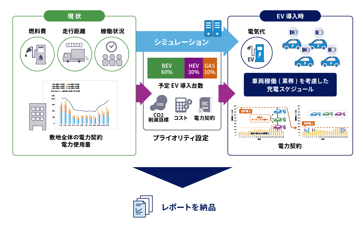 EV導入時に必要なコストや設備、充電スケジューリングのレポートを作成